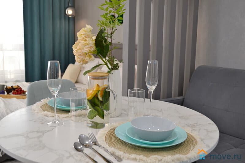 • Зона кухни: холодильник, плита, микроволновка, чайник, вся необходимая посуда